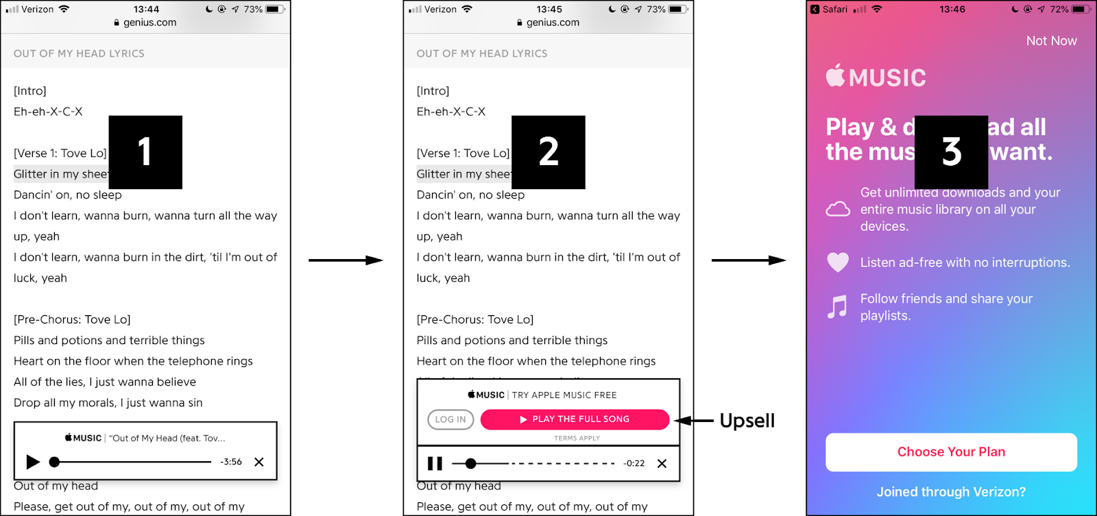 Apple Music subscribers can connect their account to listen to full songs, but by default the player plays a 30-second preview and prompts the user with an “upsell” to sign up for a free trial of Apple Music. This is a standard funnel, detailed in the diagram below, that requires the user to first click on the upsell link and then go through Apple’s on-boarding process. One idea to hammer home all the free value we were offering was to say it out loud, like a podcast ad, at the end of the 30-second preview. After all, you can close your eyes, but you can’t close your ears. Three months of free music is a great deal, but we didn’t want to subject our users to more advertising if it didn’t make a meaningful difference in our trial numbers, so we decided to run an AB test to measure the ad’s efficacy.